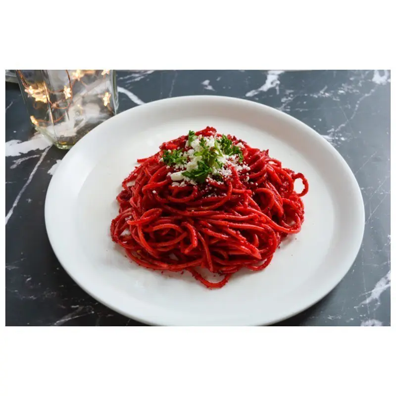 Spaghetti tossed in a vibrant roasted beetroot sauce, finished with crumbled feta and fresh herbs. Dramatic in colour, gentle in flavour — your dinner table will never look the same.