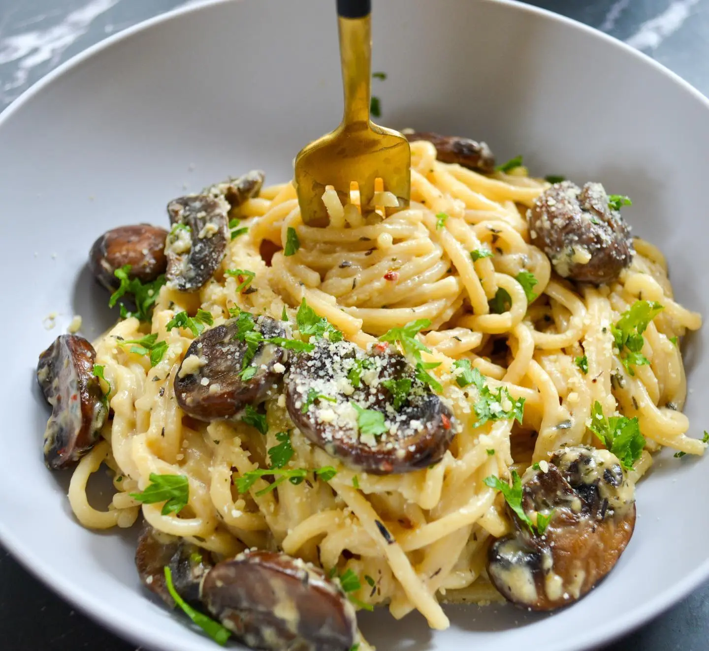 Silky, golden spaghetti tossed with buttery sautéed mushrooms in a rich garlic parmesan cream sauce — weeknight comfort that looks like a restaurant dish.