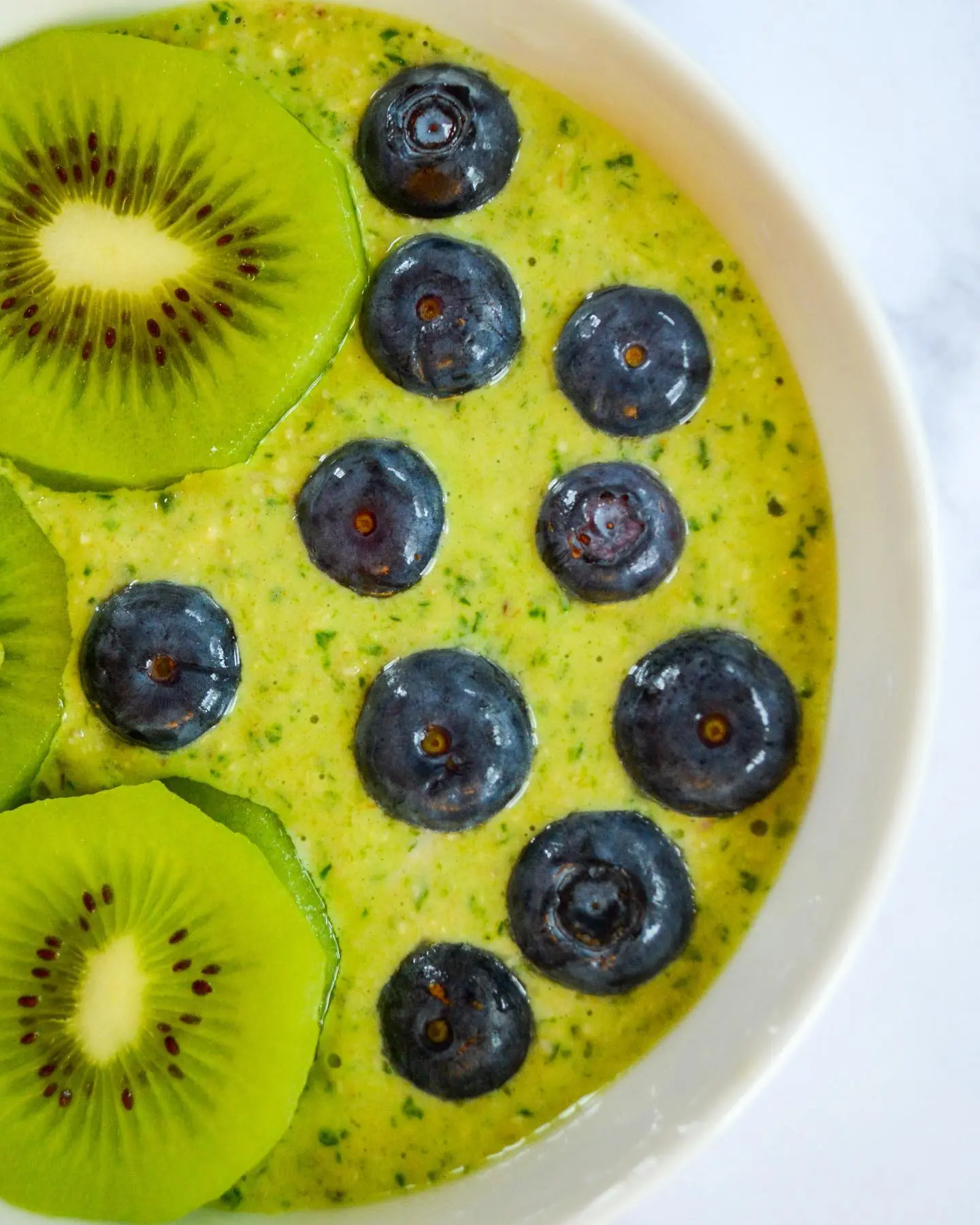 A vivid green smoothie base of kiwi and banana, topped with whole blueberries and fanned kiwi slices. As stunning as it is simple.