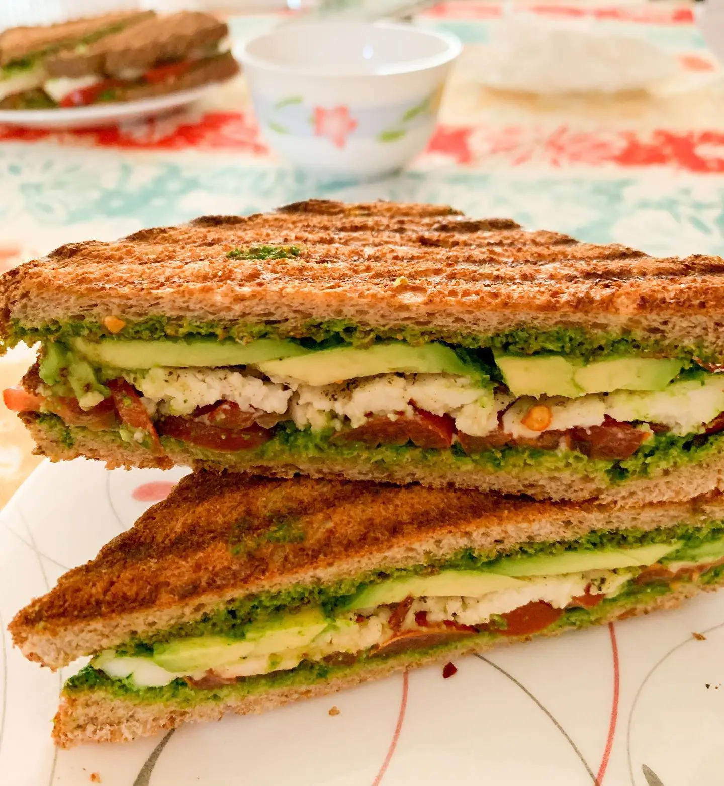 Whole wheat bread pressed and grilled with vibrant basil pesto, sliced avocado, creamy ricotta or paneer, and sun-dried tomatoes. Layers that make every bite worth it.
