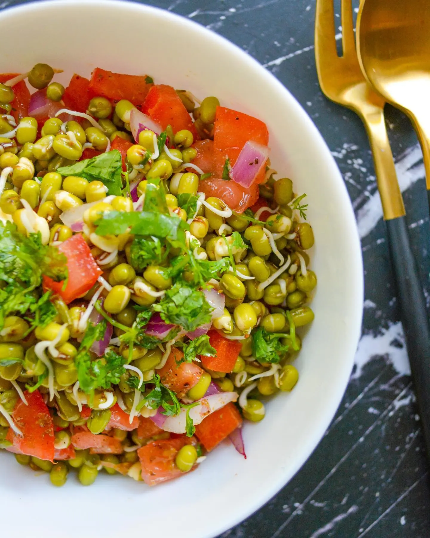 Combine sprouted moong, tomato, onion, and coriander in a bowl.