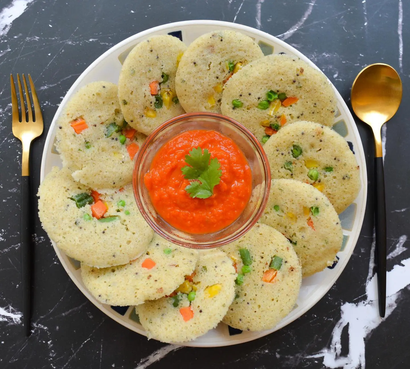 Soft, fluffy semolina idlis packed with colorful vegetables — carrots, corn, peas — and served with a vibrant tomato chutney. The shortcut idli that never disappoints.